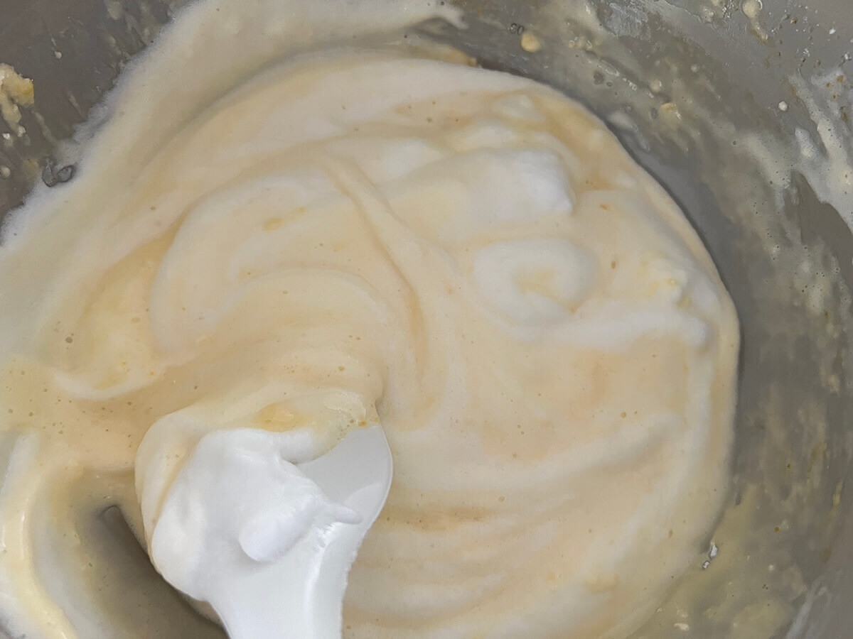 卵黄と砂糖、牛乳を合わせたボウルに、ふるった小麦粉とベーキングパウダーの半量を加えて切るように混ぜ、③で泡立てた卵白の半量も加えて切るように混ぜます。