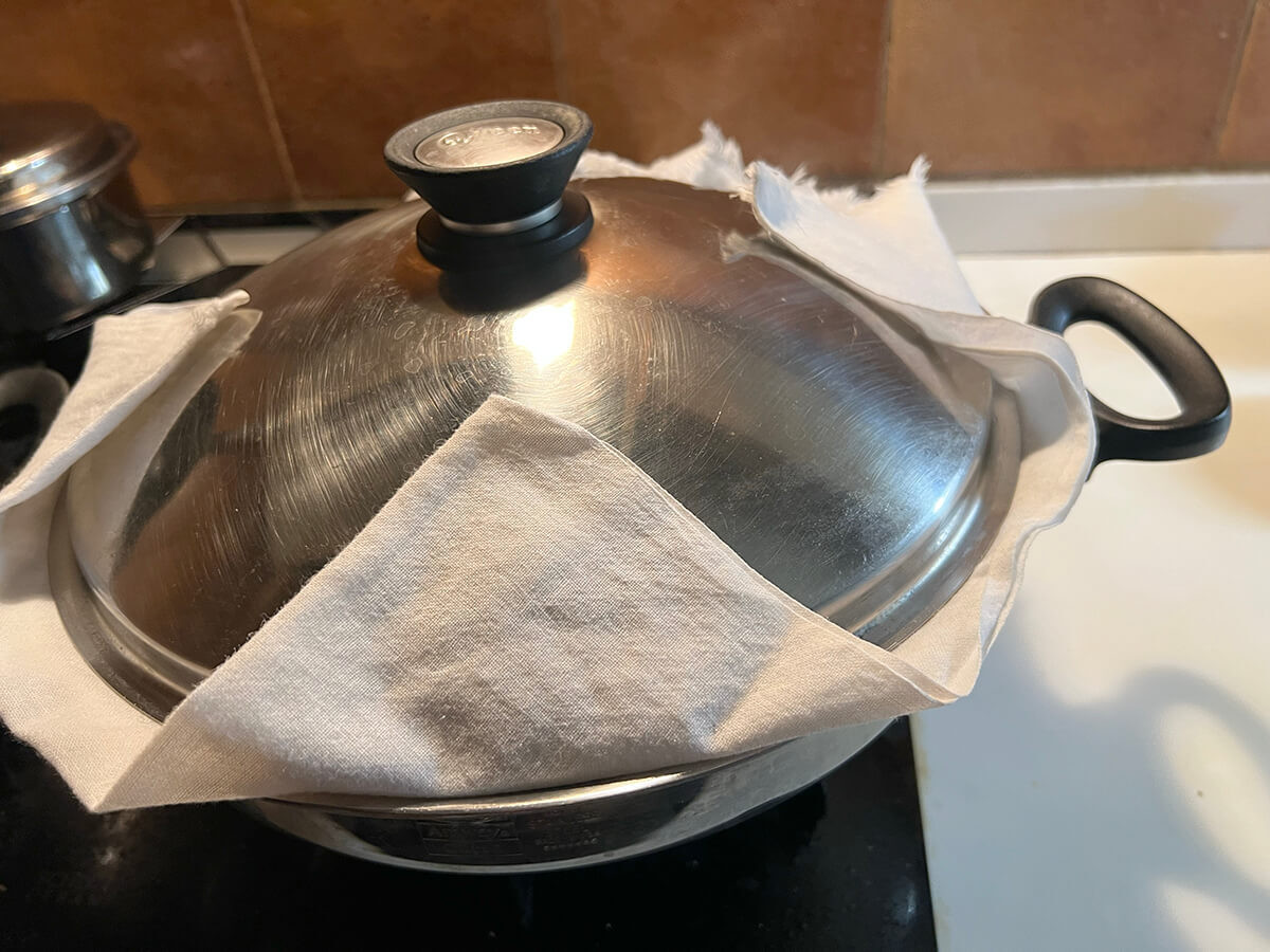 蒸気の上がった蒸し器にケーキ型を入れます。ふきんで包んだふたをして強火で12分間蒸しましょうと指示がありました。