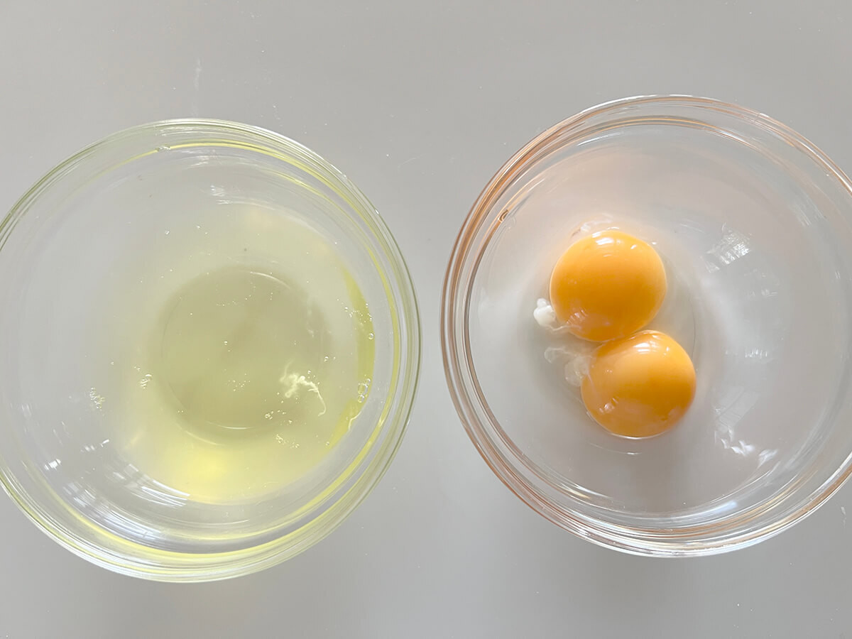 卵は卵黄と卵白に分けておきます。 【A】は合わせてふるっておきましょう。