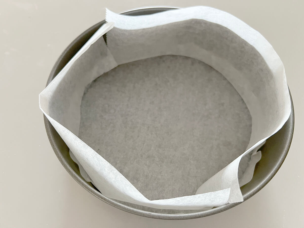 ケーキ型の底と側面にオーブン用の紙を敷いておきましょう。底が外れるタイプの型だったので、若干心配です。底の丸をひと回り大きめに作り、少し立ち上がりを作って液漏れを防ぐ作戦でいくことに。