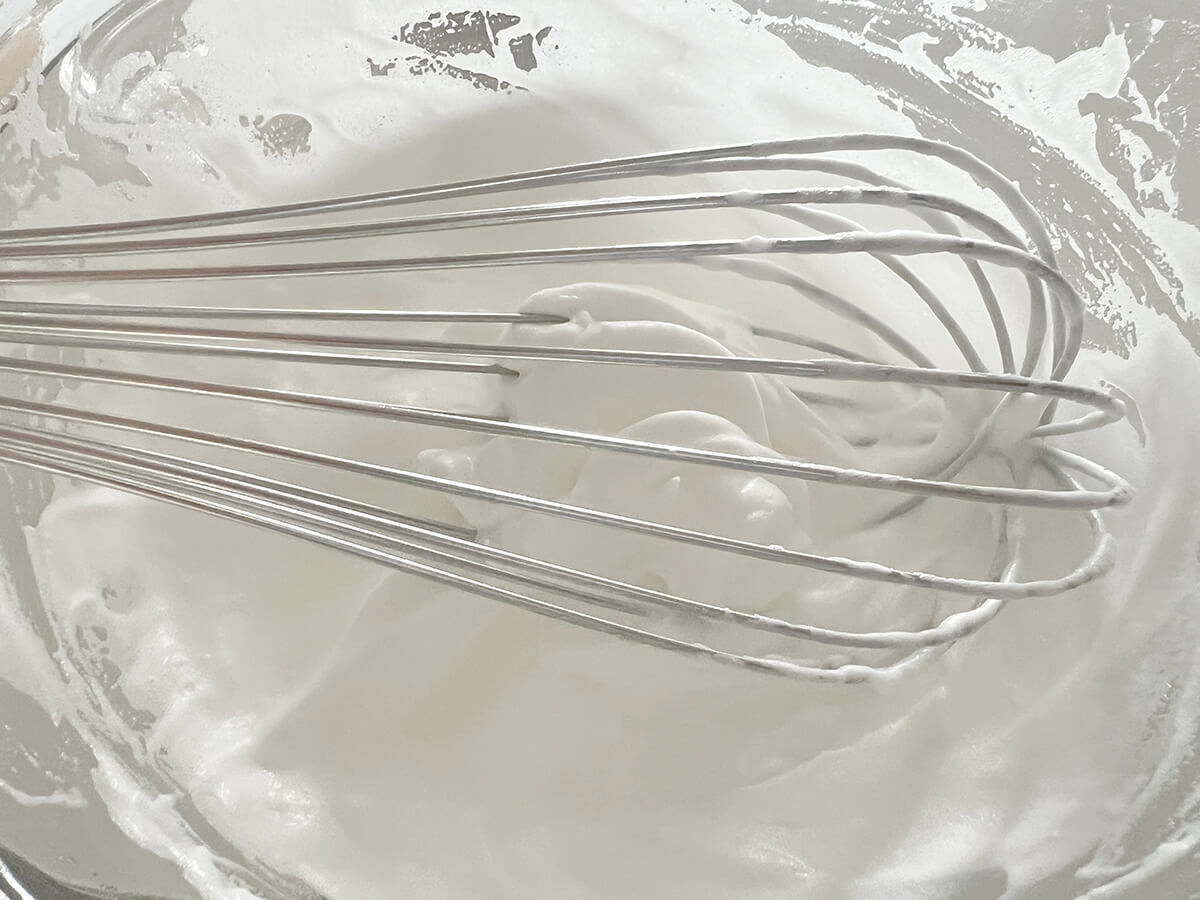 別のボウルに卵白を入れ、ある程度泡立てたら、残りの砂糖を加えてツノが立つまで泡立てます。
