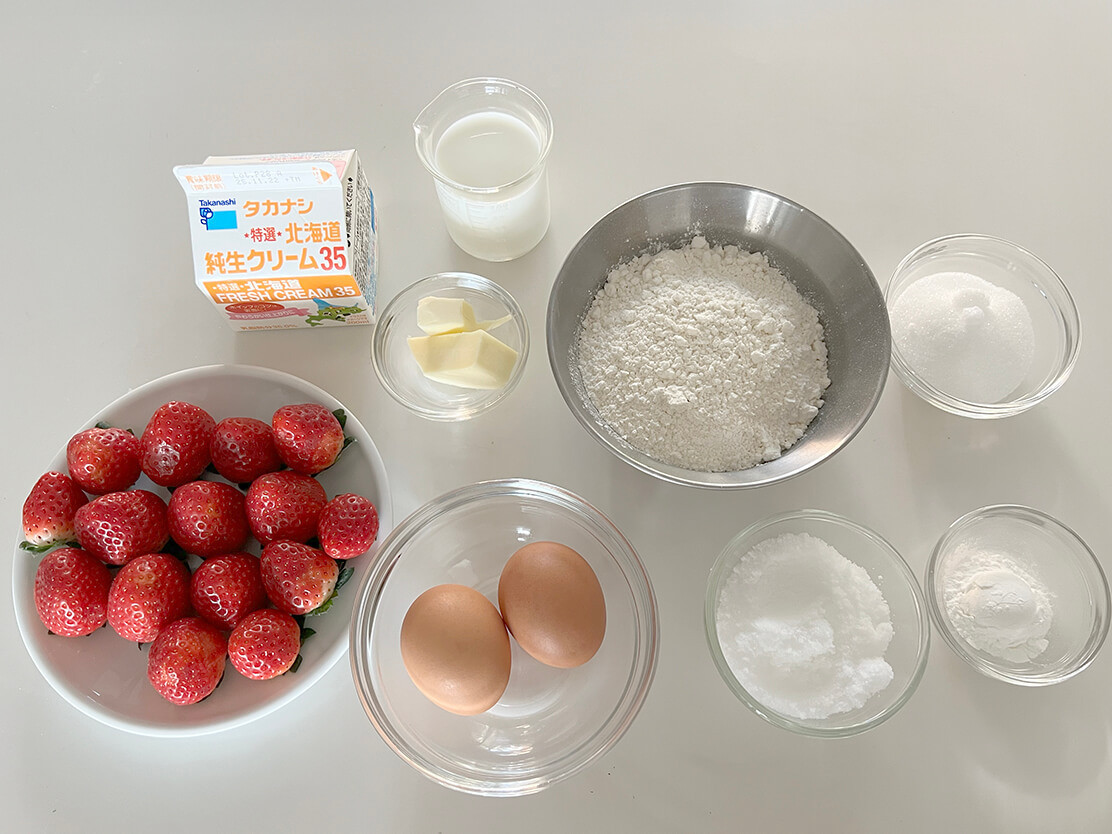 【C】のフルーツは好みのものでよいとのことなので、いちごを用意しました。野望は大きく、ショートケーキをイメージしています。