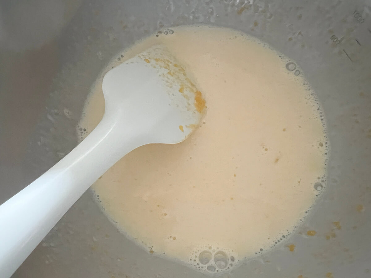 ボウルに砂糖の半量(25g)と卵黄を入れてよく混ぜ、牛乳を加えてさらによく混ぜましょう。まだシャバシャバの液体です。