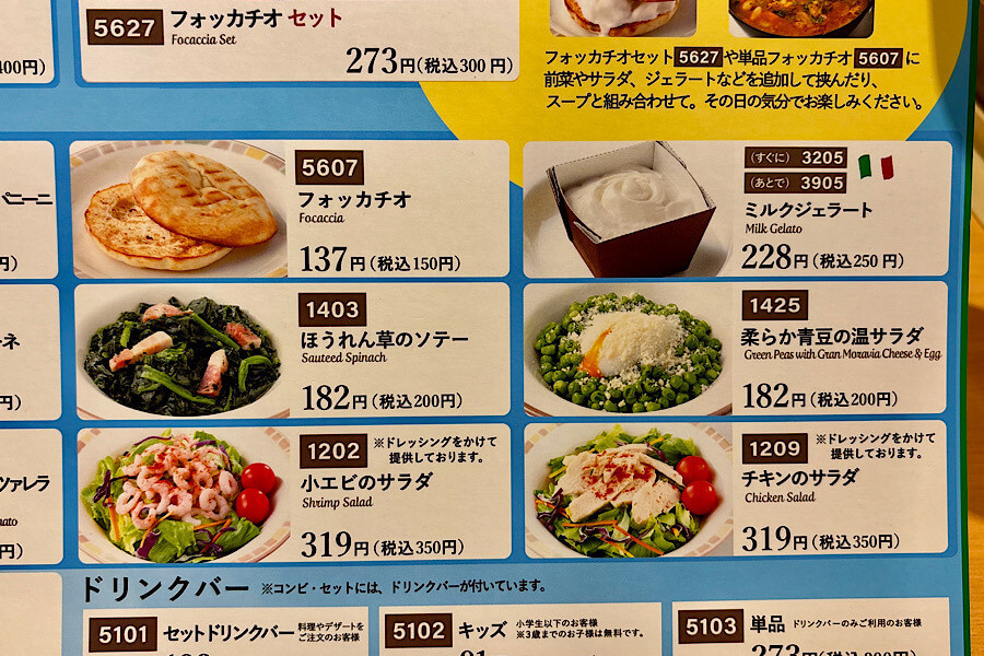 「コンビ」はドリンクバー付き、「セット」はドリンクバー&ポテト付きです。