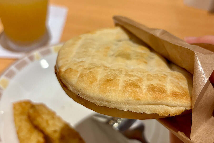 外カリ中ジュワのフォッカチオがまずいわけありません。ひと口食べてアップルジュースを飲むと、確かにアップルパイの風味。