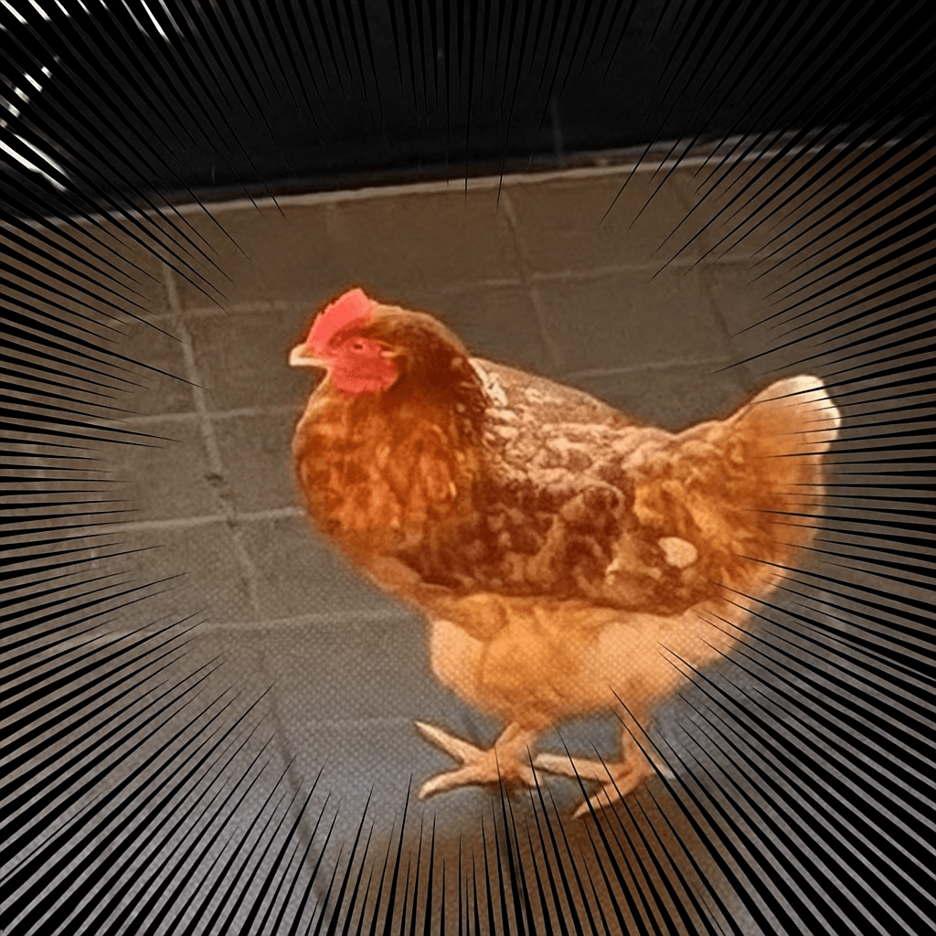 「クックルー♪」という元気な鳴き声と共に、1羽のふっくらしたニワトリの姿が!