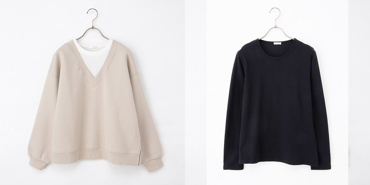 ▲裏起毛ゆるレイヤード風¥2,980(税込)、あったか綿クルーネックT¥1,680(税込)