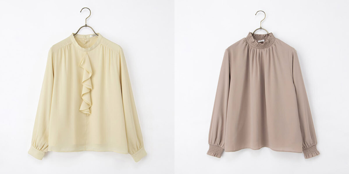 ▲あったか裏地ラッフルブラウス¥2,980(税込)、あったか裏地ハイネック¥2,980(税込)