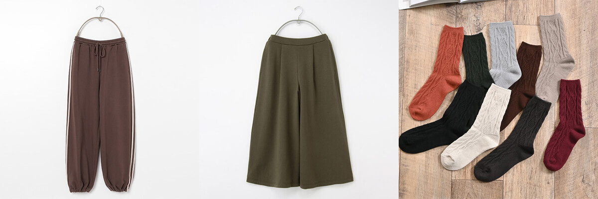 ▲あったかライン入りパンツ¥2,980(税込)、あったかガウチョパンツ¥2,480(税込)、なめらかケーブル編クルー丈ソックス¥260(税込)