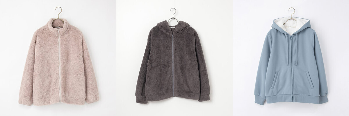 ▲ボアスタンドジップカーデ¥2,280(税込)、ボアジップパーカー¥2,480(税込)、裏ボアジップパーカー(男女兼用)¥3,480(税込)