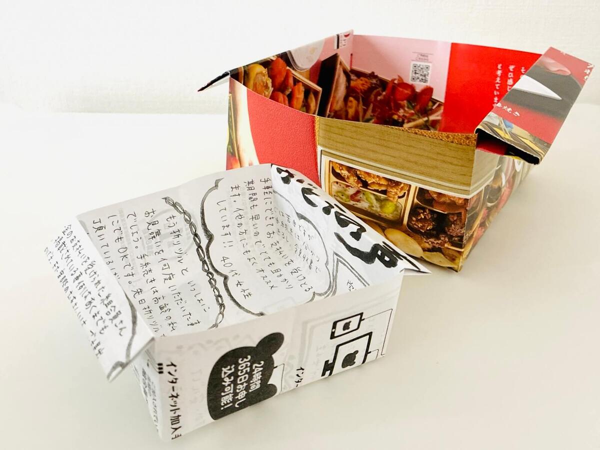 お菓子の大袋を開いて折ったゴミ箱。見た目はチラシ紙で作ったものと同じですが……なんといっても、こちらは防水タイプ!!