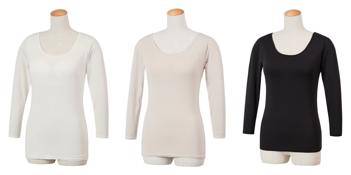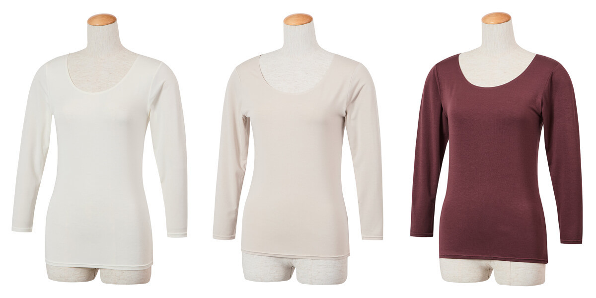 深すぎず、チラ見えしにくい襟元と九分袖でトップスから出にくく、袖で風が入りにくく暖かいインナー。