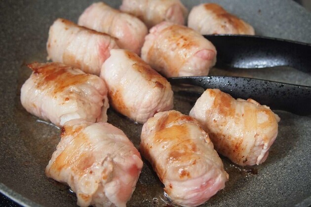 最初はあまり触らないようにし、しっかりと焼き目がついて巻き終わりがくっついたら転がすと、お肉がはがれません。