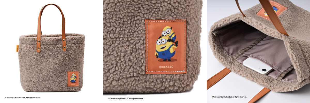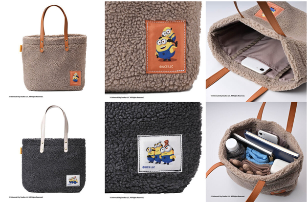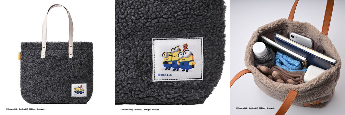 「ボアバッグ」は、冬シーズンにぴったりのふわふわなボア素材を使用し、キュートなミニオンのワッペンをあしらったアイテムです。カラーはグレーとブラウンの2種類をご用意しており、お好みに合わせてお選びいただけます。