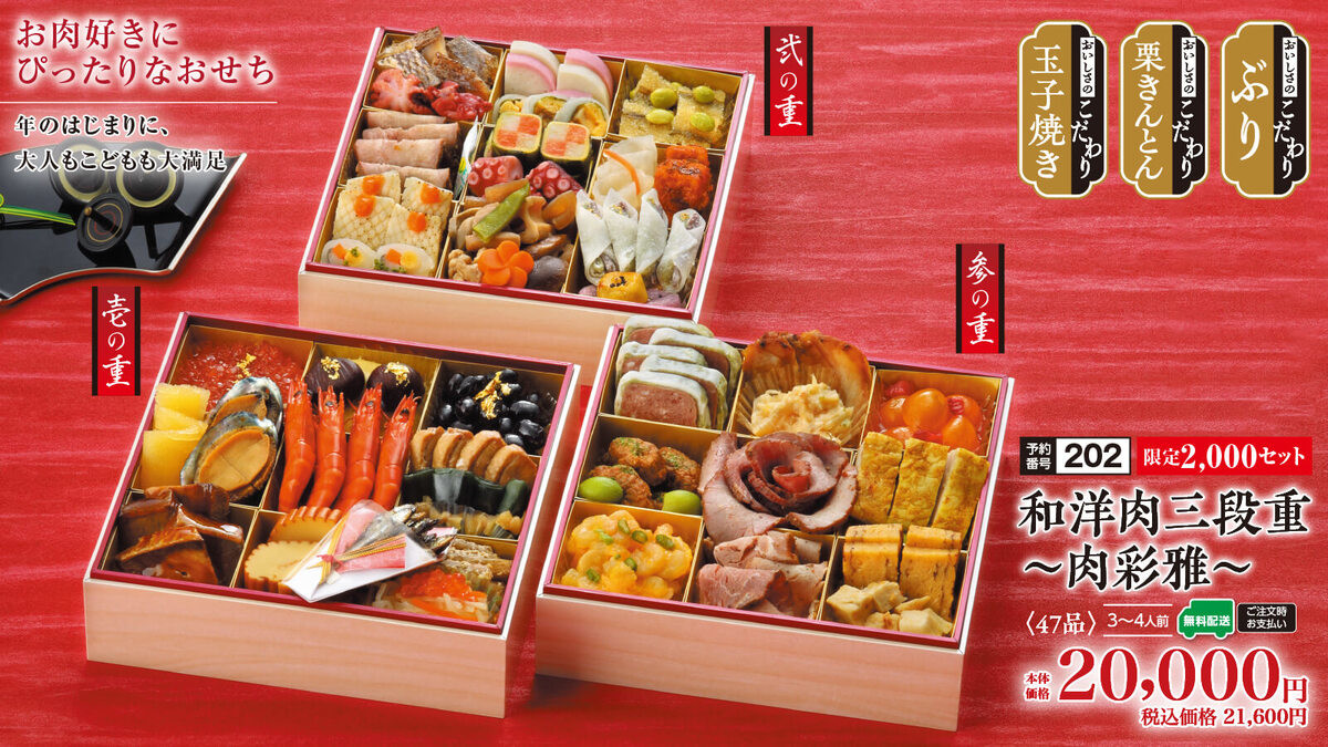 中の人おすすめ③ 和洋肉三段重 〜肉彩雅〜 本体価格20,000円(税込21,600円)
