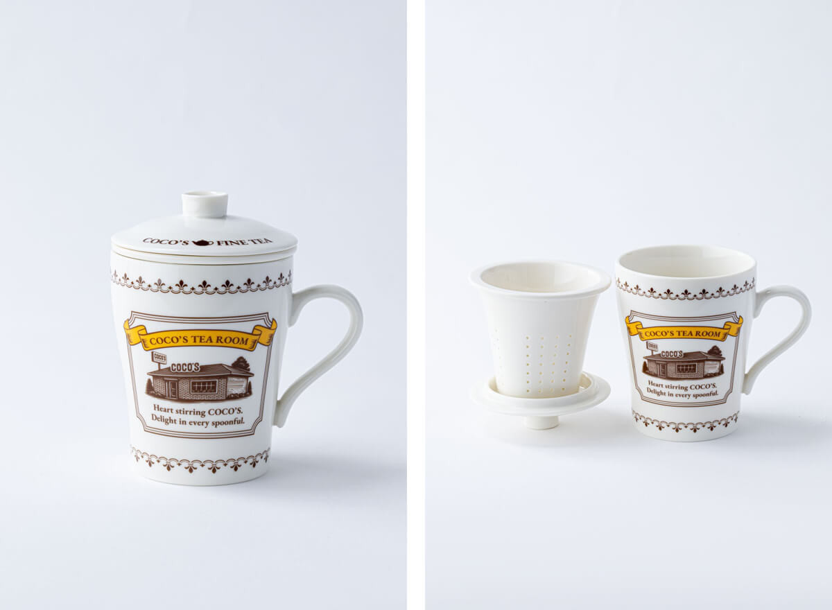 ココスの店舗が英国風のイラストで描かれた、茶こし付きの陶磁器製マグカップです。陶磁器の程よい重みとレトロなデザインが重厚感と高級感を演出します。