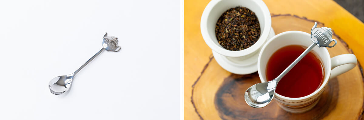 ココスのロゴがあしらわれた、ティーポットデザインの持ちやすい柄が特徴的なティースプーン。