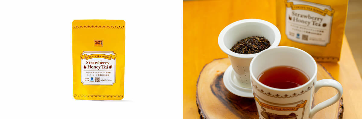 ネパールのカンチェンジュンガ茶園で茶園労働者が丁寧に手摘みした茶葉を、ストロベリーハニーフレーバーとして仕上げた「ココスオリジナルティー」です。