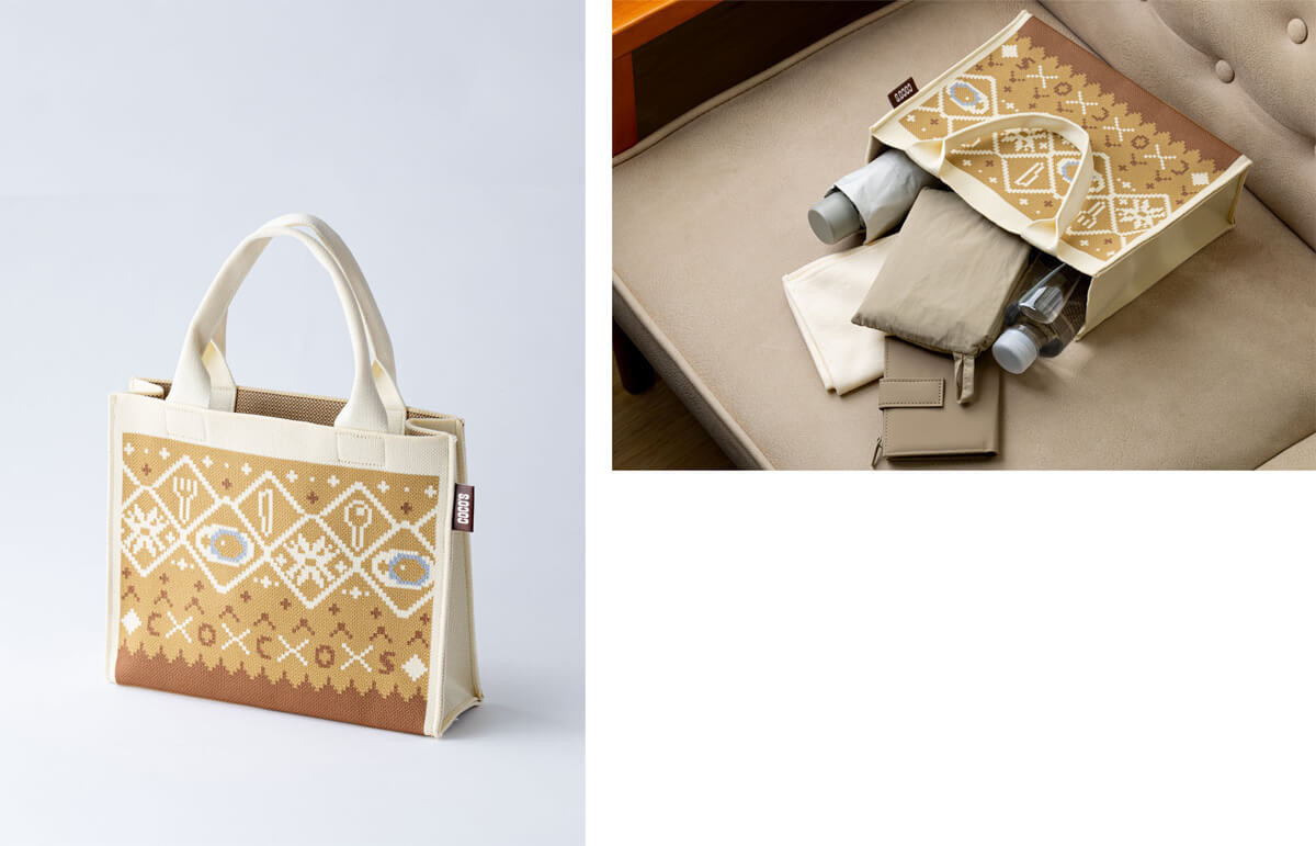 包み焼きハンバーグやナイフ、スプーン、フォークといったココスらしい商品をデザインに取り入れた、冬にぴったりなノルディック柄のニットバッグです。