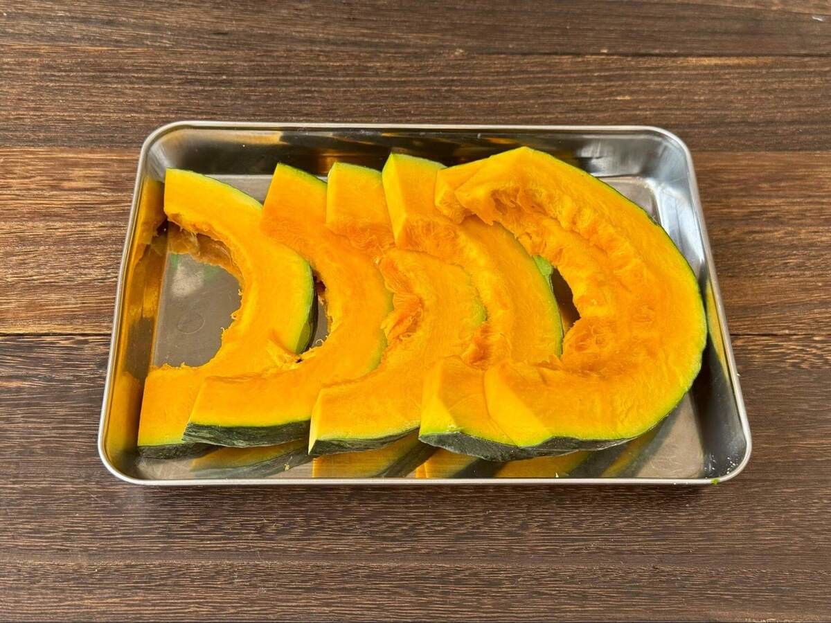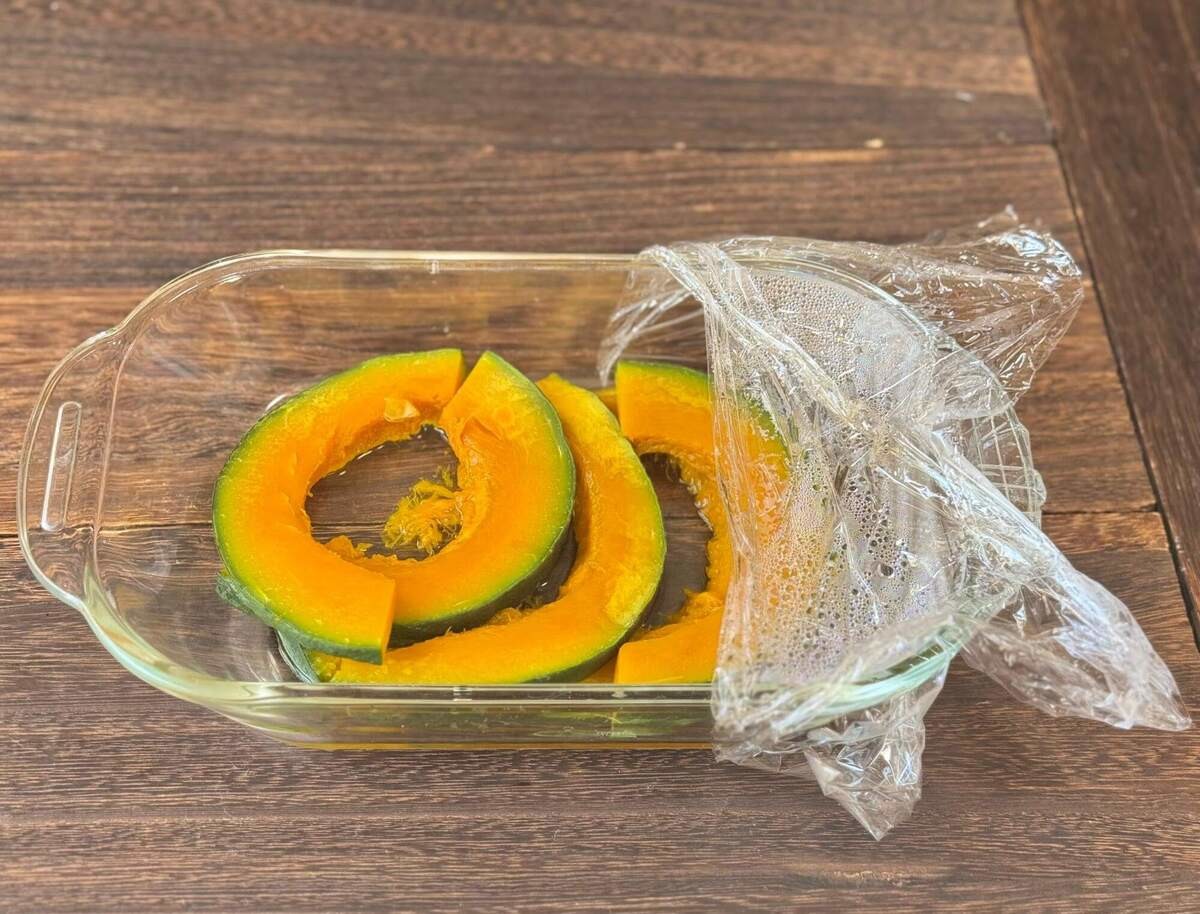 ほくほくの栗かぼちゃを使ったせいか、4分だと崩れてしまう部分もありました。気になる方は、様子を見ながら加熱時間を調整してみてくださいね。