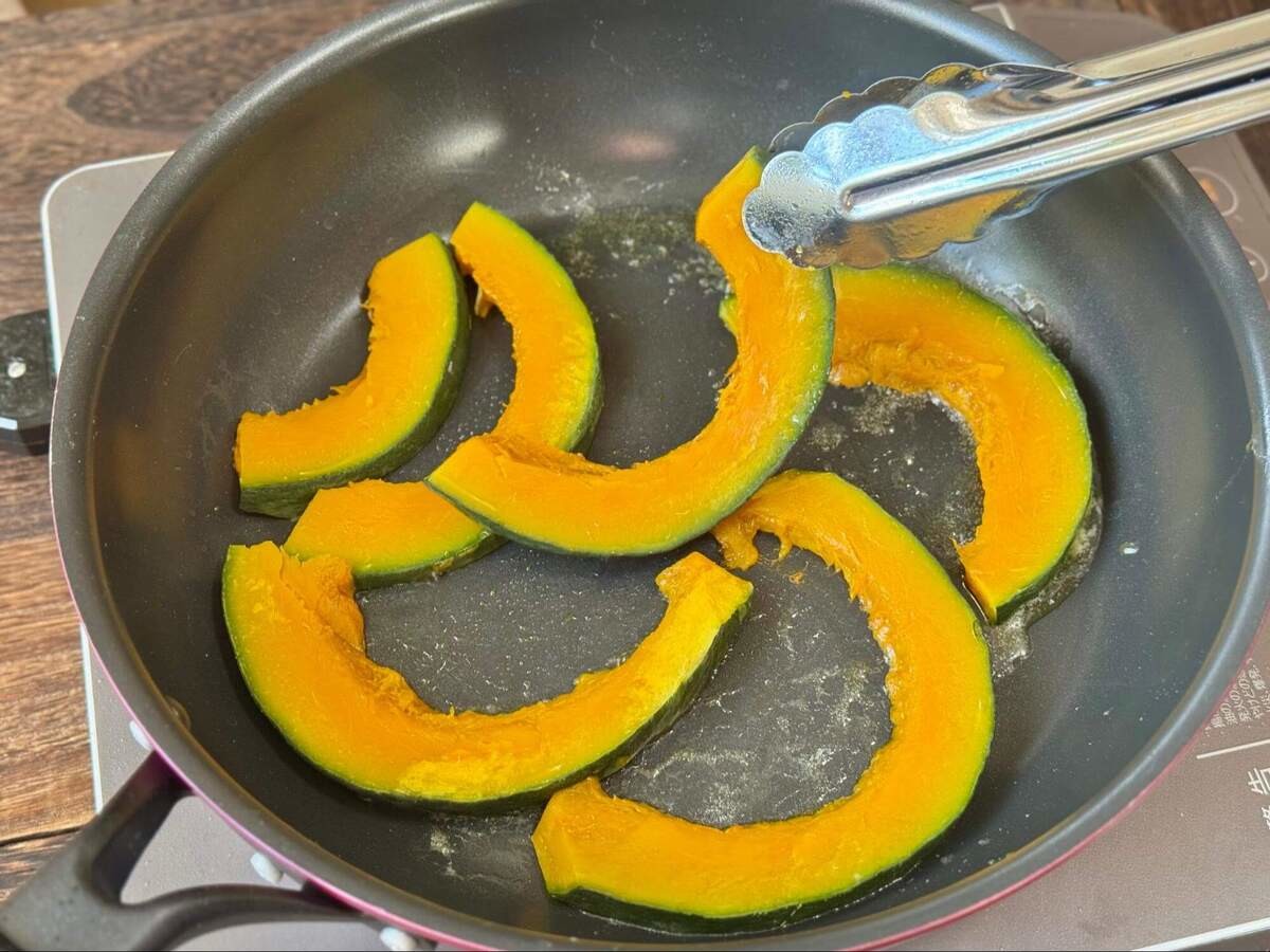 フライパンにバターを溶かし、かぼちゃを並べ入れます。中火で、両面にこんがり焼き色をつけましょう。