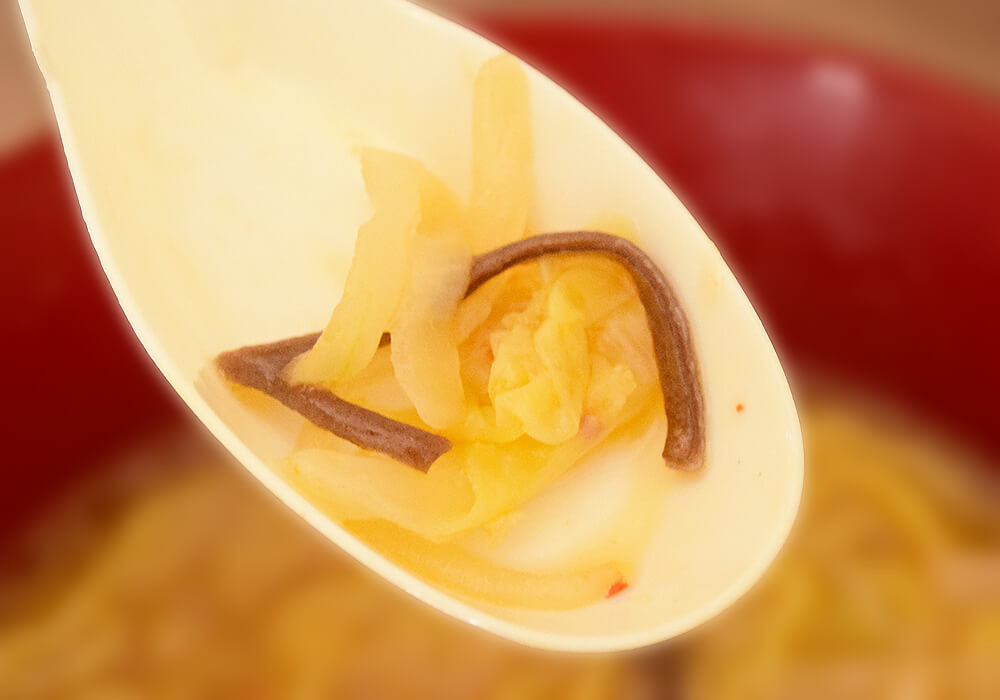 具材は少なめながらも、キャベツ・玉ねぎ・コーンの他にきくらげも入っていますね。軽く食事をしたい時にはちょうどいいボリューム感。