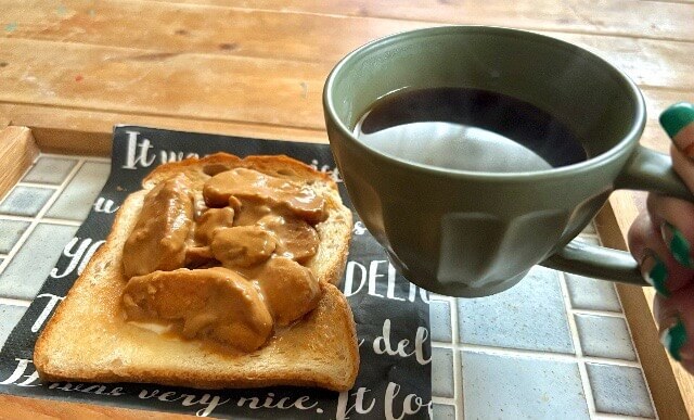 キャラメル煮を作った翌日の朝食は、パンにのせていただきました。酸味、甘味、苦味も合わさって、お店のキャラメル煮を食べている気分になりました。