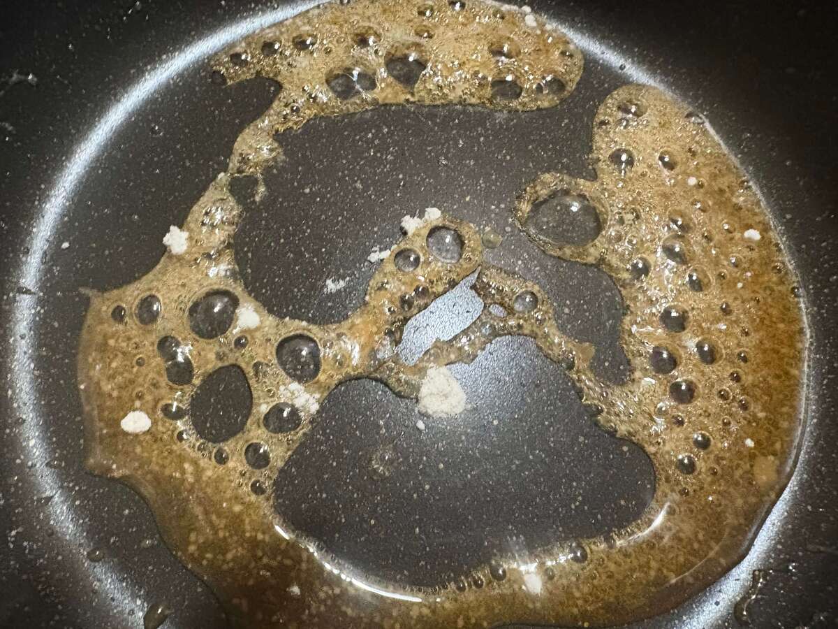 グツグツして煙が出て、色が茶色になってきても我慢。大丈夫、私も不安です。