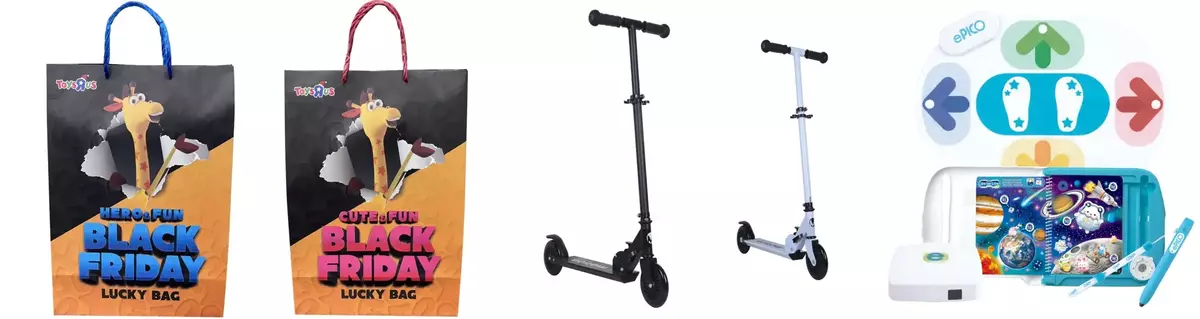 毎年ご好評を頂いている「トイザらス Black Friday おたのしみ袋 (HERO&FUN/CUTE&FUN)」(各3,999円<税込>/メーカー希望小売価格12,000円以上相当)※3に加え、今年も「ブラックフライデー」セールにぴったりな黒色のキックスクーターを1,997円の大特価でご提供。さらに、トイザらス限定自転車も当店通常価格から50%OFF。