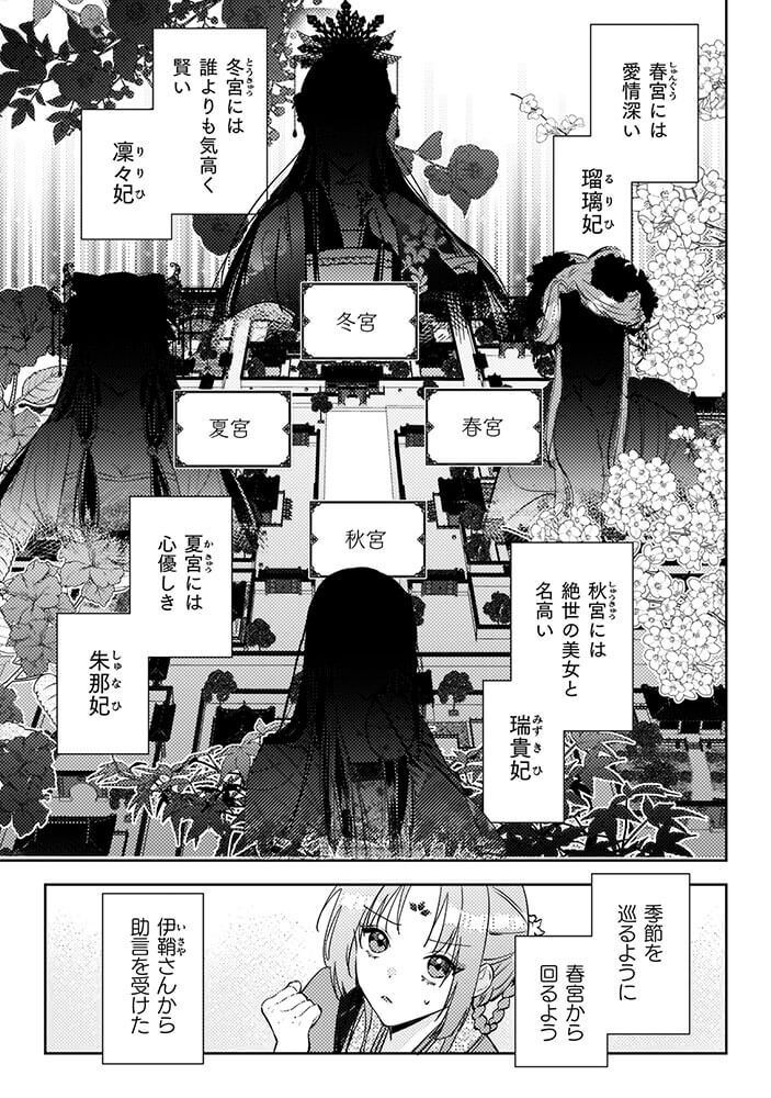 借金を背負う大ピンチの時、食堂の常連だった陽伊鞘(よういさや)に助けらますが、料理の腕を見込まれ、後宮付きの薬膳医になる羽目に……。