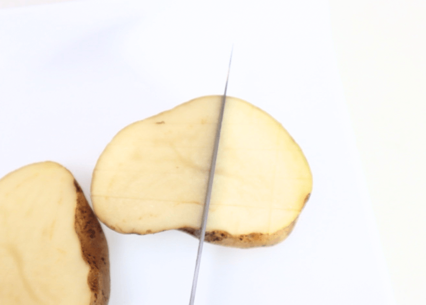 じゃがいもを半分に切ったら、断面に1cmくらいの間隔で格子状に切り込みを入れましょう。