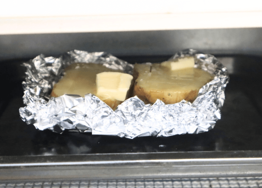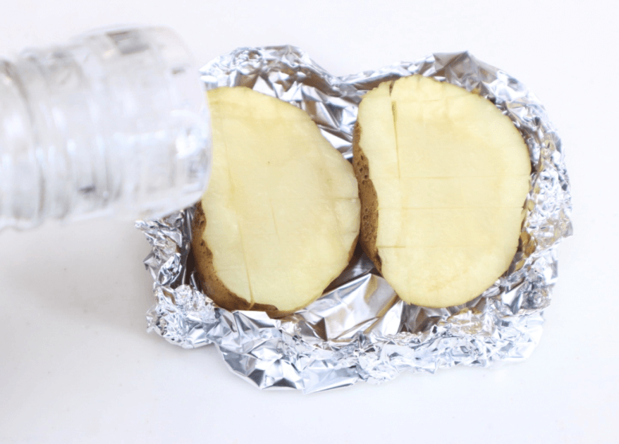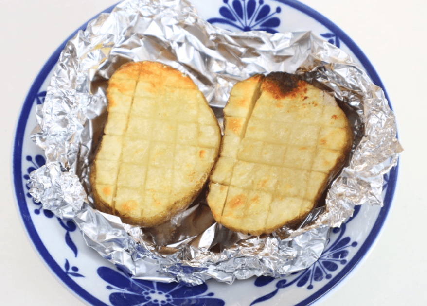 火傷に気をつけながら電子レンジから取り出し、ラップとキッチンペーパーを外しましょう。次に、断面を上にして2つのじゃがいもをアルミホイルで囲います。