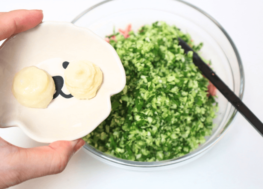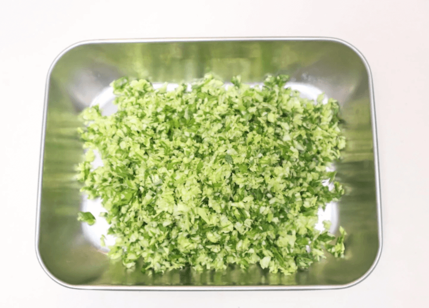 この後一緒に豚ひき肉に混ぜ込むので、みじん切りマシンを使う場合は同時に切ってしまってもOKです!