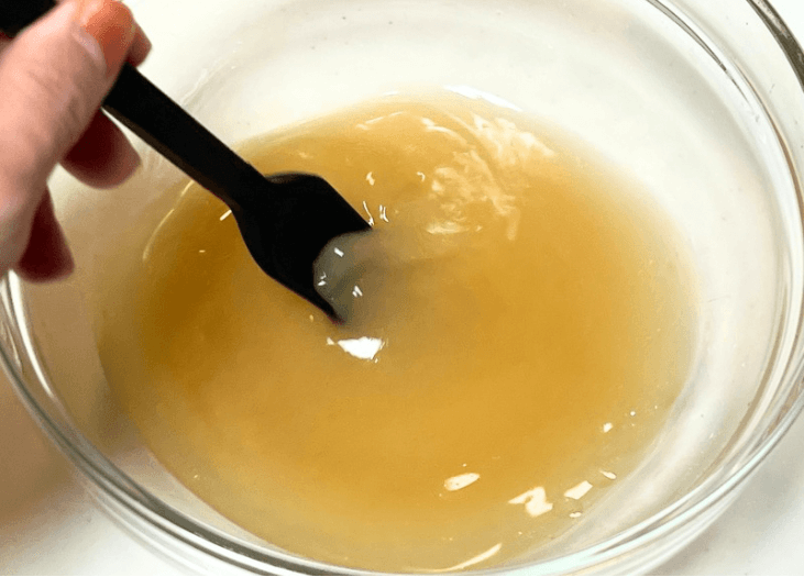 ボウルにかつおだし・片栗粉・みりん・醤油を入れて、片栗粉を溶かすようにしっかりと混ぜます。