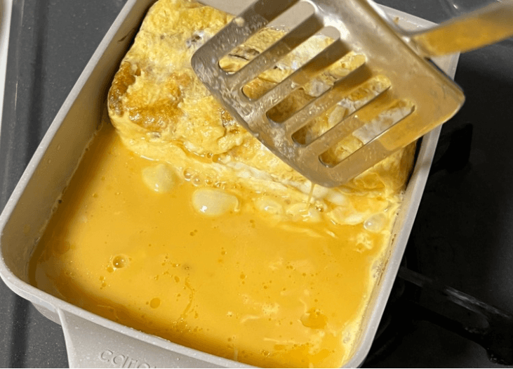 水分量が多いだし巻きを巻くときは、菜箸ではなく、和田明日香さんも使っているようにヘラで巻くと形が崩れにくくおすすめ!