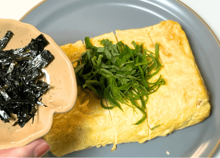 巻き終えただし巻きは食べやすい大きさに切り、お皿に盛り付け、刻みのり・大葉を上からふわっとのせれば完成です♡