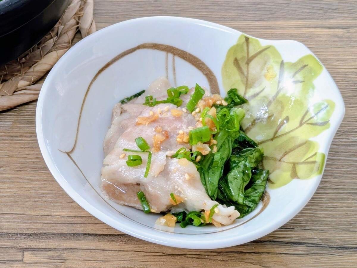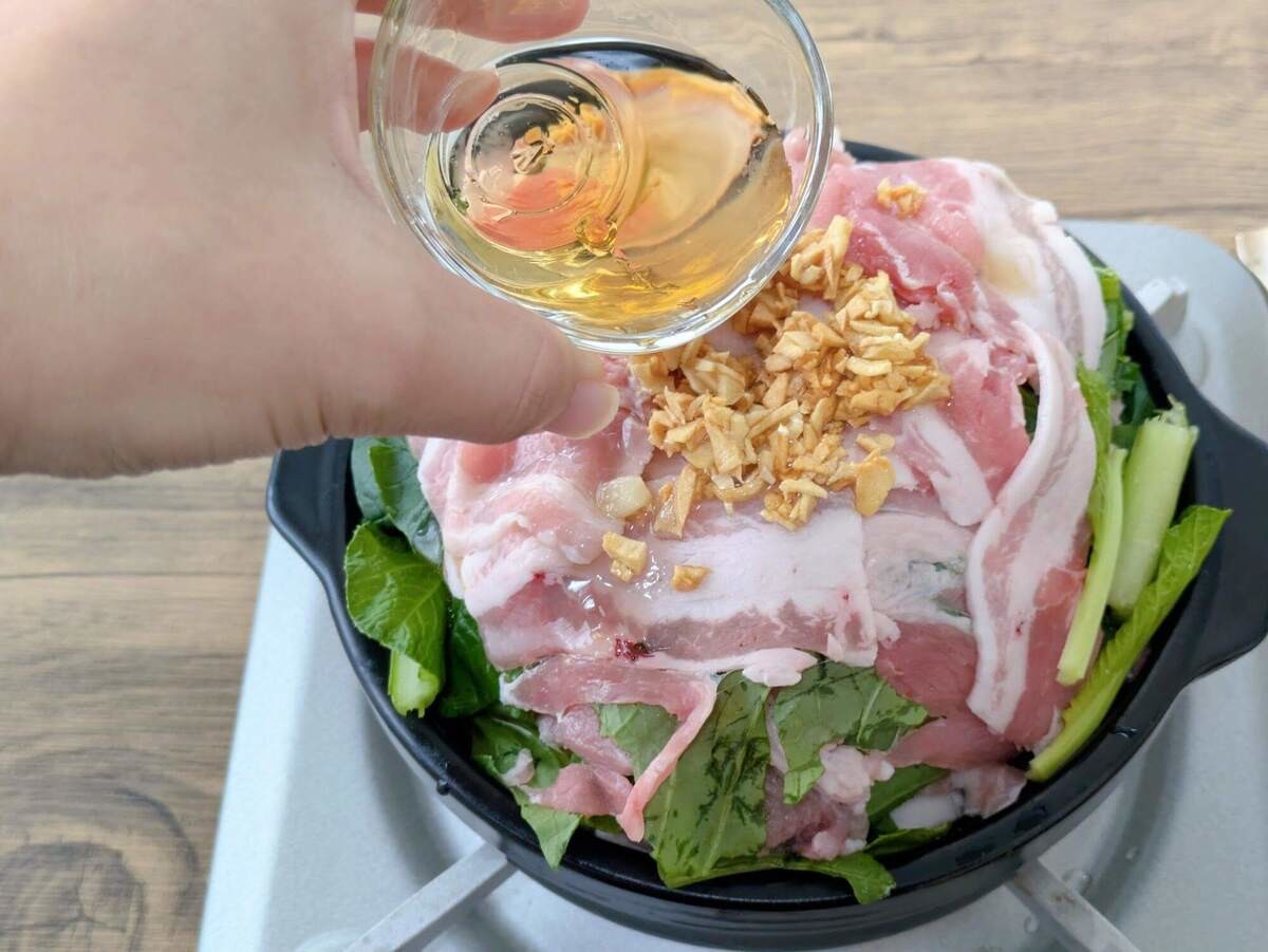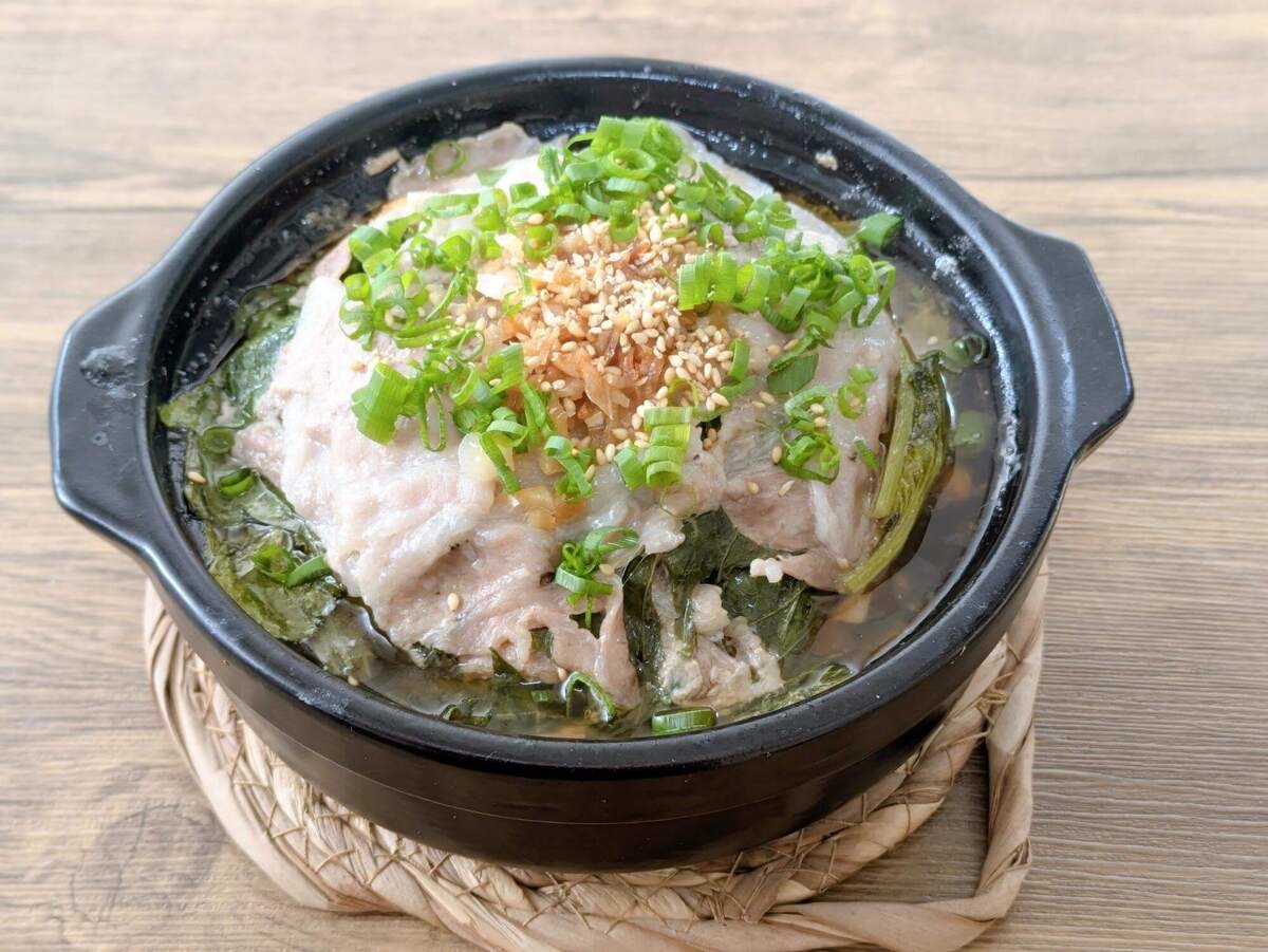 たっぷりの小松菜と豚バラ肉をニンニク、ごま油で風味付けした無水調理鍋。想像しただけで食欲が掻き立てられます。