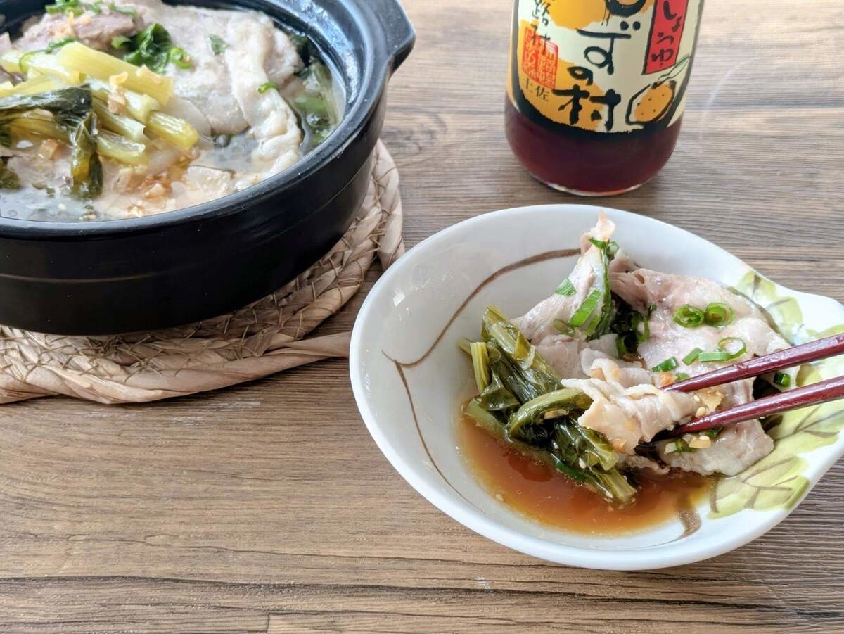 一本一本に小松菜と豚肉の旨みが染み込んでいて、シメまでしっかり美味しい!ポン酢や七味をプラスして味変するのも良いですね。