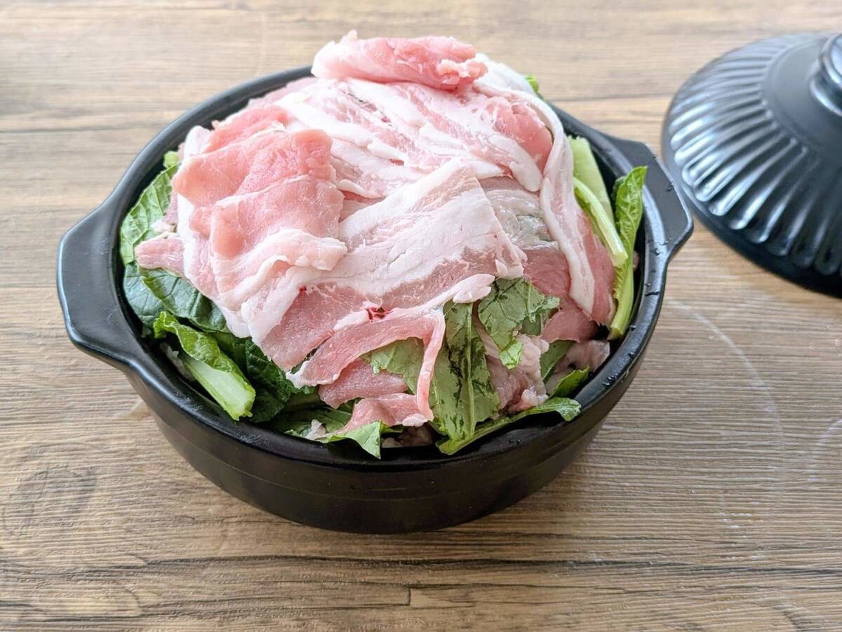 我が家の土鍋は小さいので、豚バラ肉を一番上にのせると、肉同士がくっついて塊になってしまいそう。そこで、茎→豚バラ肉→葉→豚バラ肉の順に重ねました。