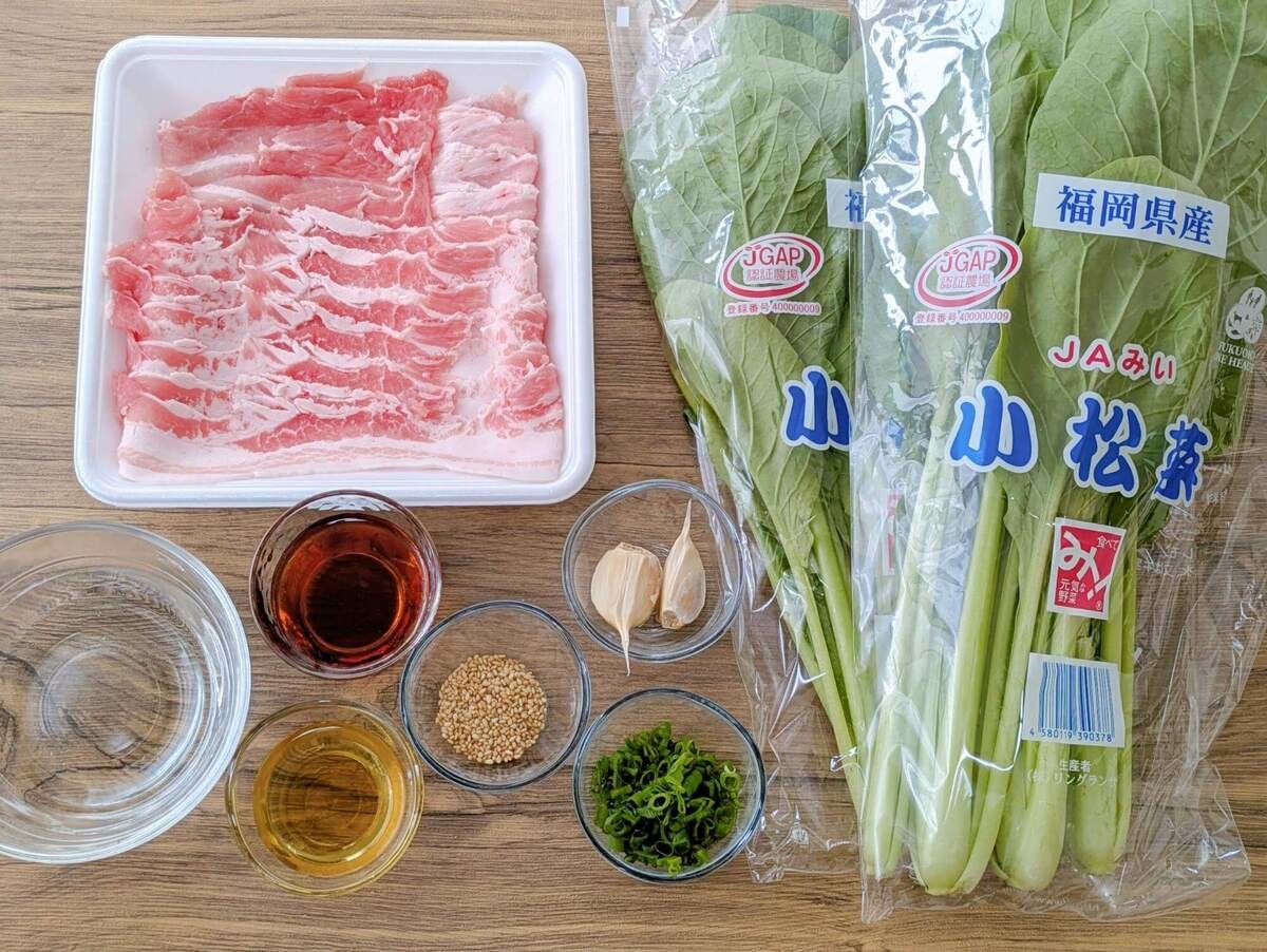 小松菜の根元を切り落としてよく洗い、3cm幅に切ります。豚バラ肉は3〜4cm幅に切りましょう。