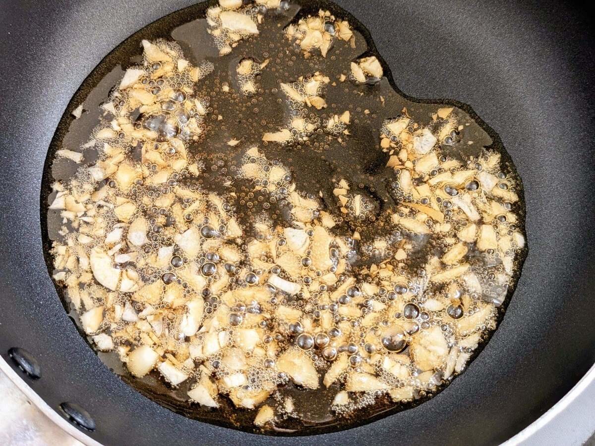 フライパンを熱してごま油を引き、ニンニクを入れて“柴犬色”になるまで炒め、③に油ごとのせます。