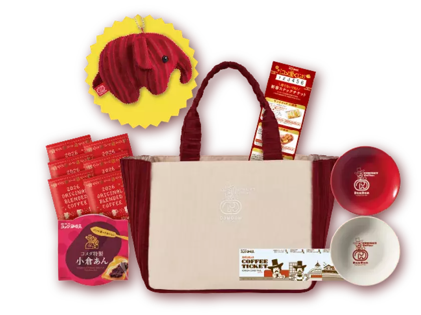 お正月のコメダ珈琲店を彩る福袋、2026年は全国に29店舗(2025年10月末時点)を展開するハンバーガーチェーンであり、象のキャラクター「どむぞうくん」をはじめとするオリジナルグッズでも大人気の「ドムドムハンバーガー」とのコラボレーション!