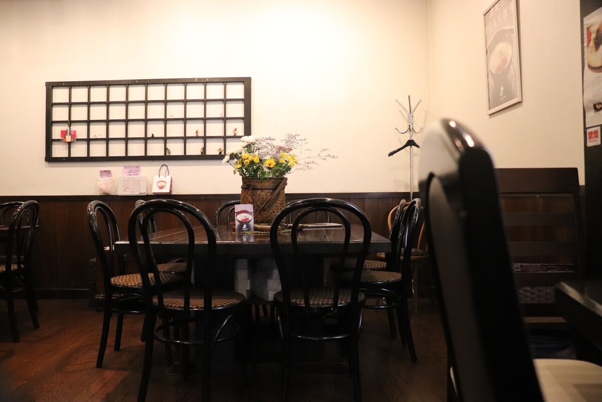 店内にはテーブル席が並び、上品で落ち着いた空間が広がっています。席に座ると、ほっと心が和むような雰囲気です。