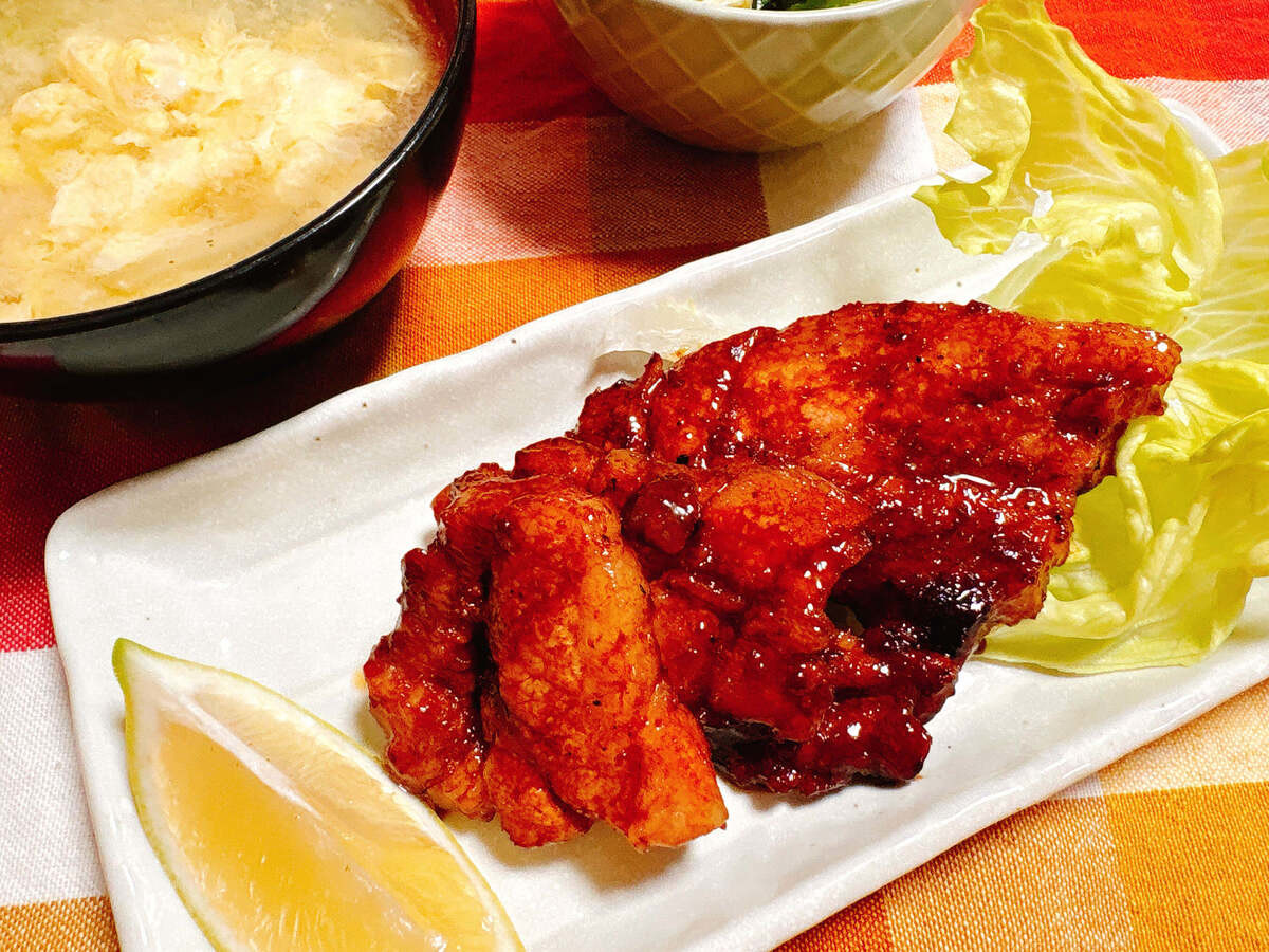 しょうゆベースの秘伝のたれで漬け込んだ厚切りの豚バラ肉なんて、ご飯が進まないはずがありません。