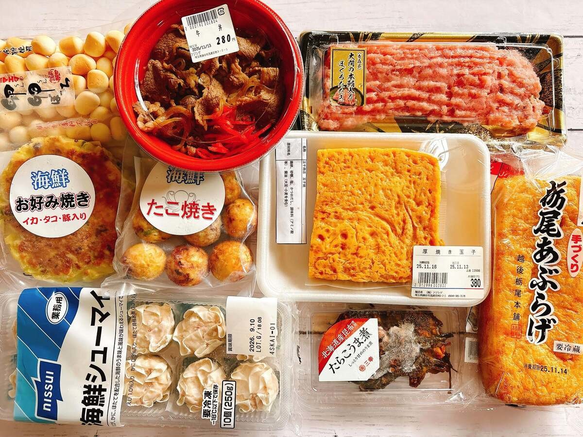 ほかにもお寿司屋さんでよく見るタイプの厚焼き玉子や常備したい冷凍のお好み焼きやたこ焼きなどをお買い上げ。小さいですが、たらこうま煮は100円と掘り出し物でした。