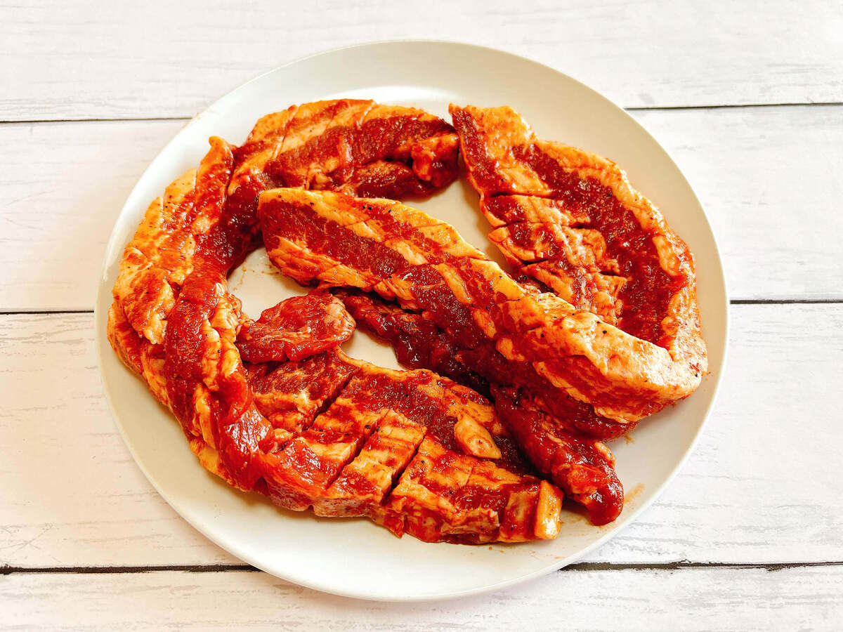 そのまま焼くだけで、脂までおいしいバーベキュー系の甘辛お肉になりました。