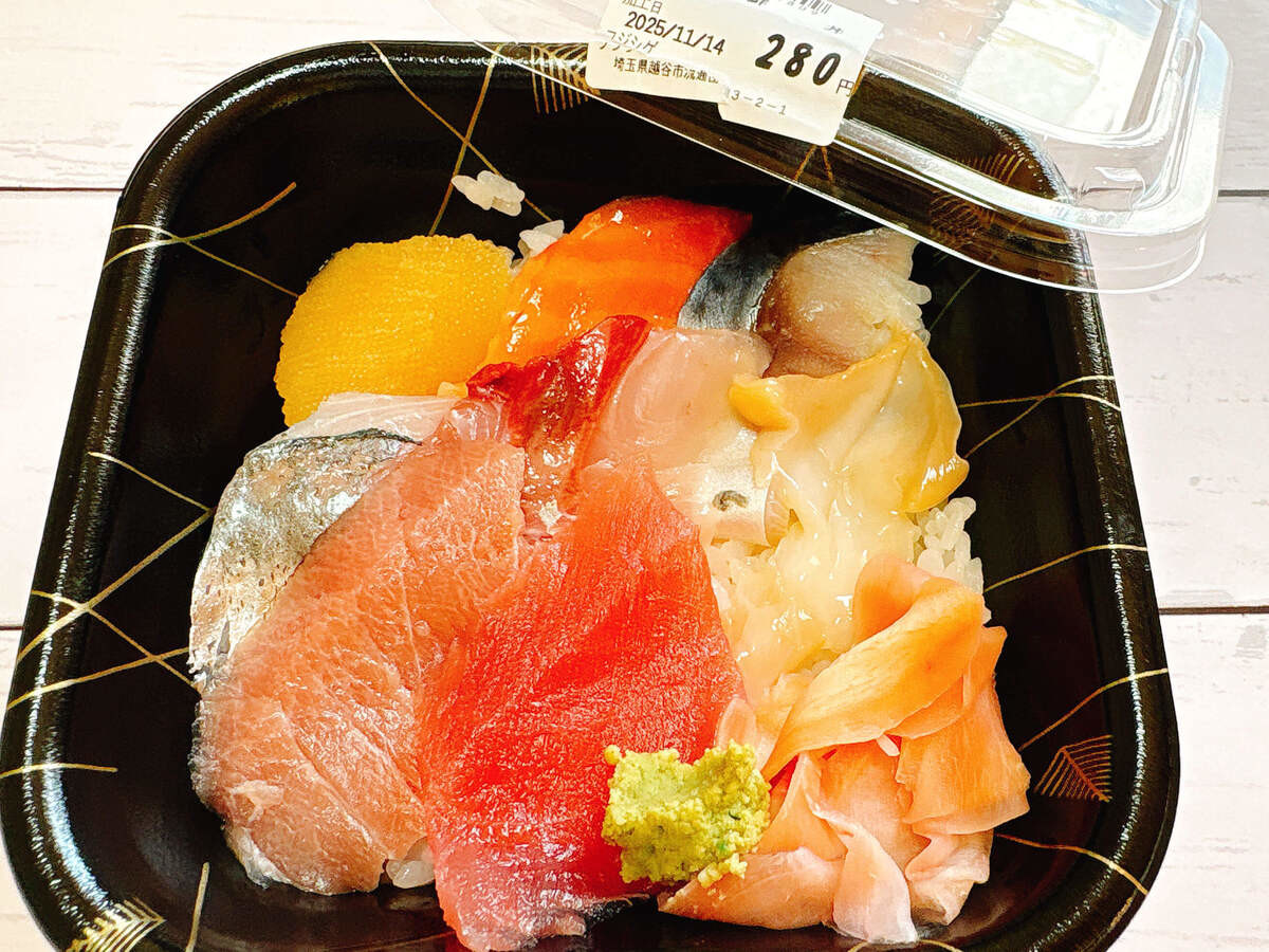 海鮮丼はそこまで大きくはないものの、まぐろや数の子などが入って280円は安すぎます。