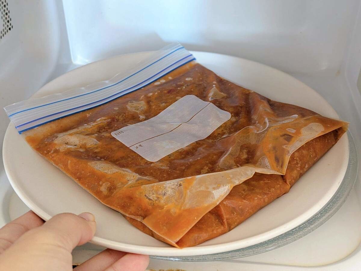 冷凍したミートソースを袋のまま耐熱皿にのせ、封を開けて200Wの電子レンジ(解凍モード)で約2分加熱します。完全に温めると袋の耐熱温度を超える場合があるので、ここでは半解凍に留めておきます。