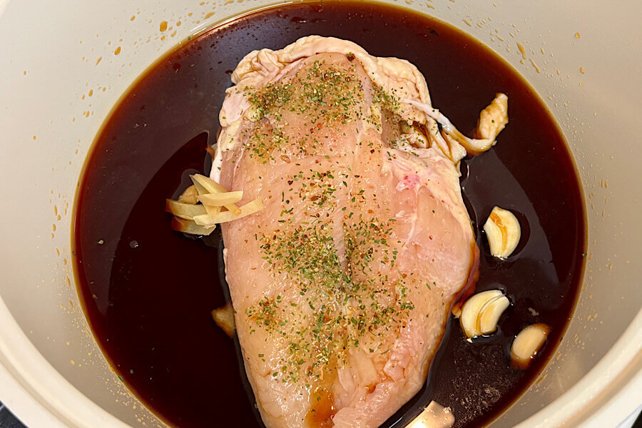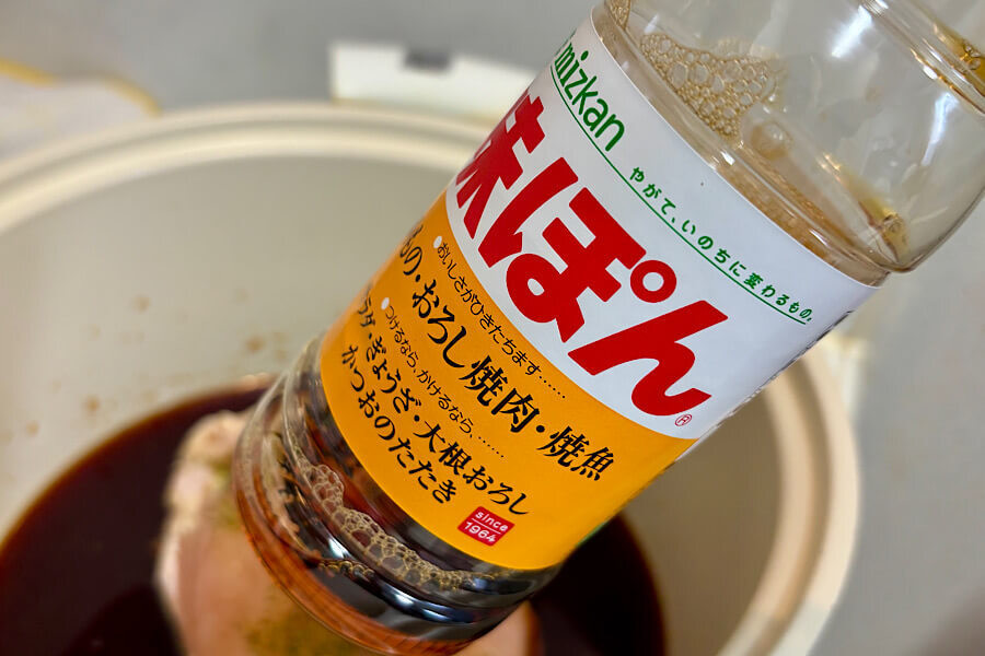 - 鶏むね肉を鍋に入れ、ポン酢を肉が半分浸るくらいまで入れる。