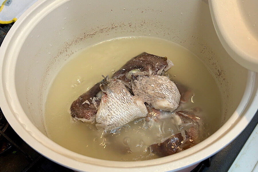 - 鍋に水と魚のアラを入れて30分火にかける。